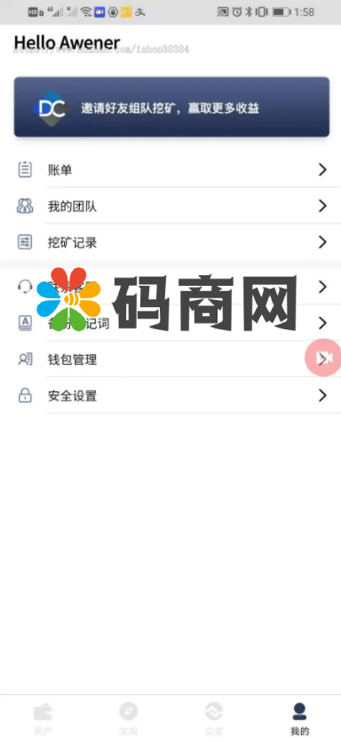 页面包含个人的分享邀请好友、矿池挖矿、币币交易、拼团游戏,等功能。