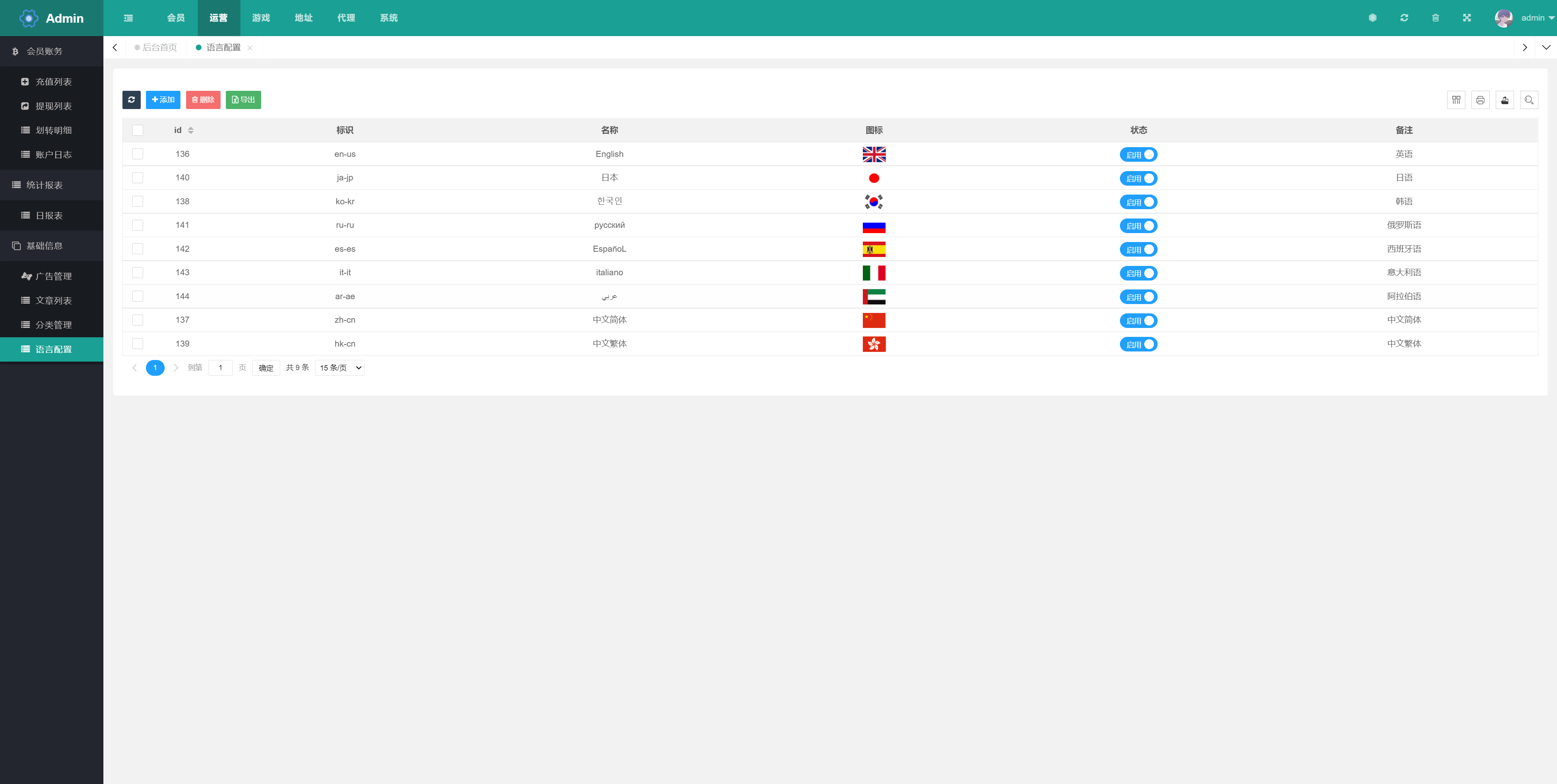 前端支持九国语言,后台可显示隐藏开启语言
