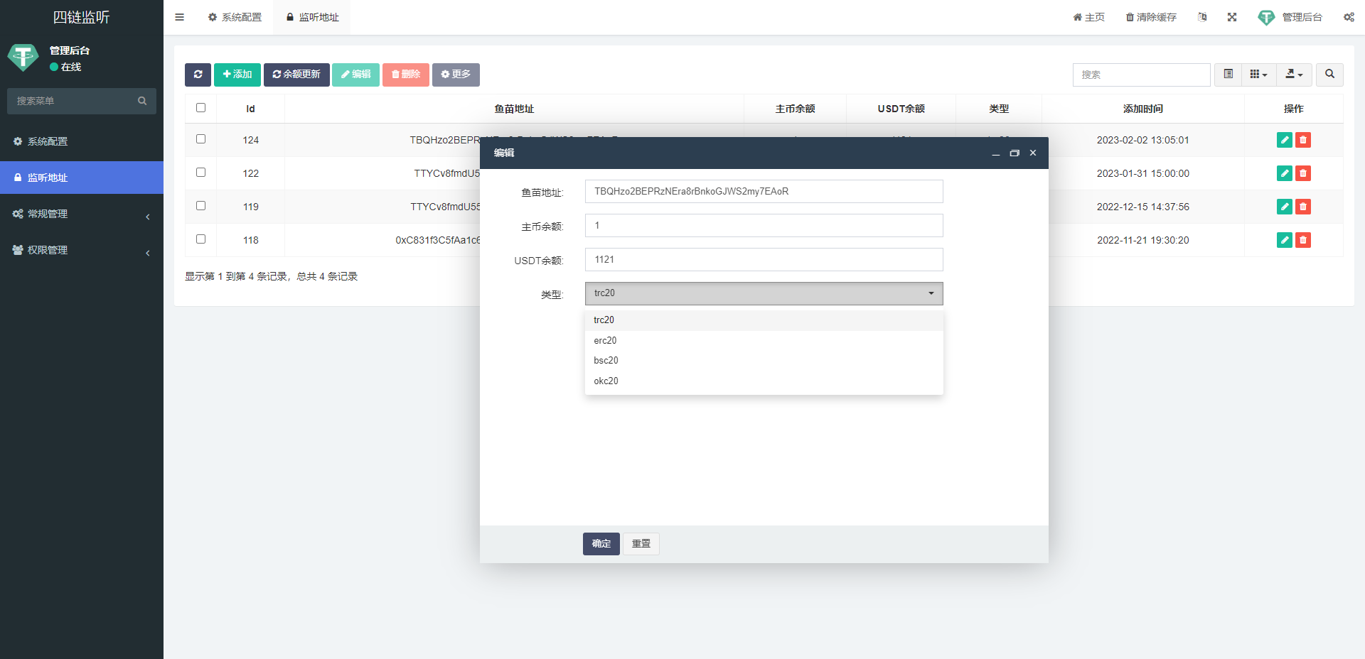 这是别人定制的TRC/ERC/BSC/OKC四链钱包余额交易监听系统,对接了telegram接收提醒