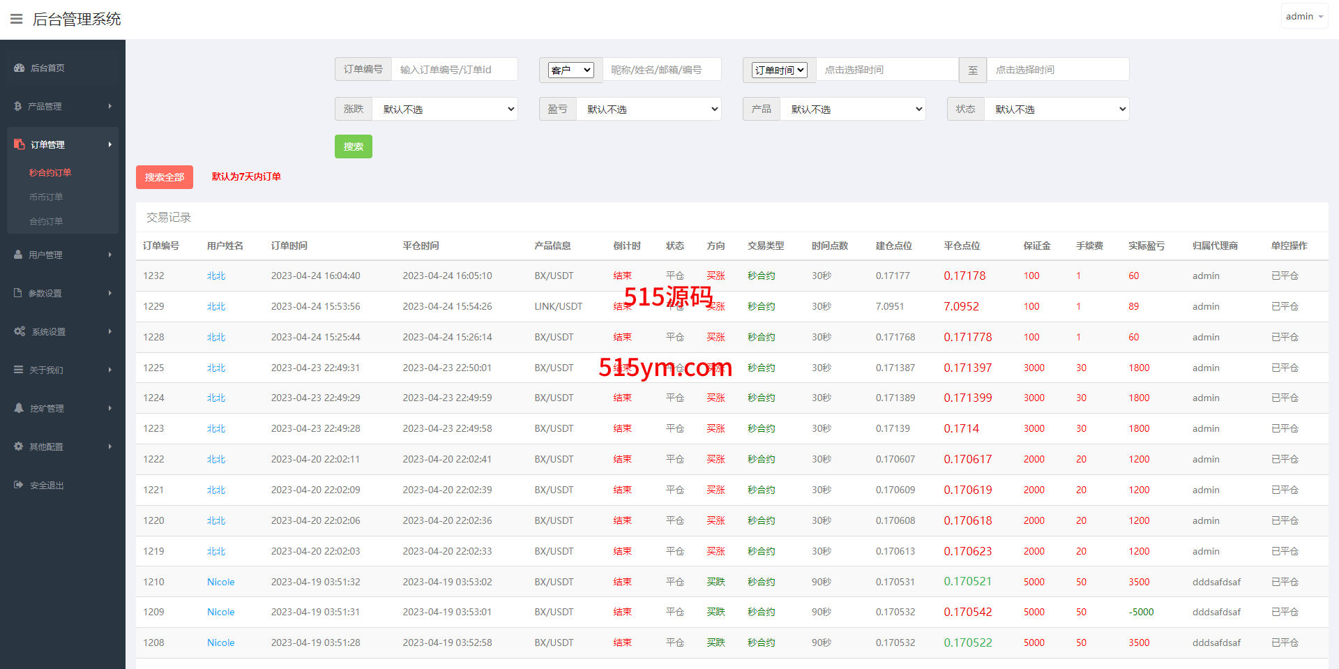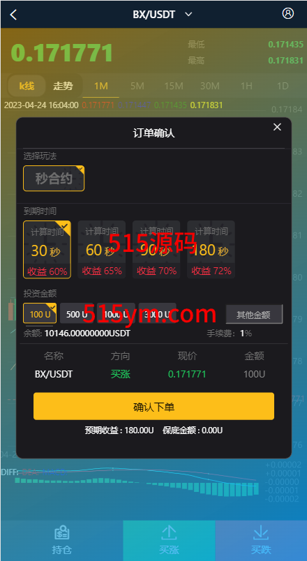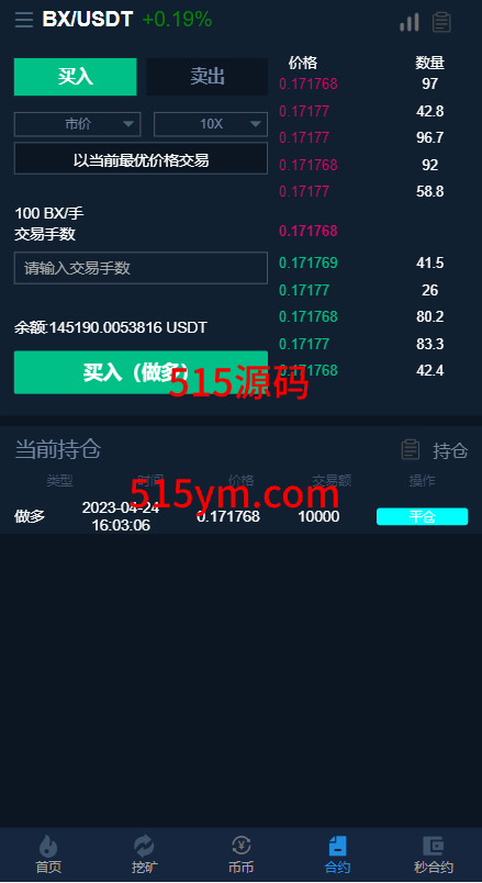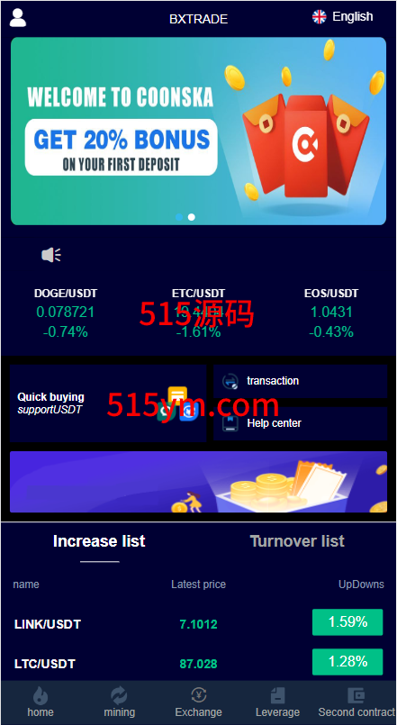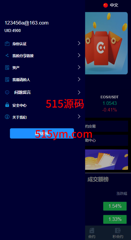 系统支持币币交易、合约交易、秒合约交易、质押挖矿、实名认证、邀请推广、客服系统等功能