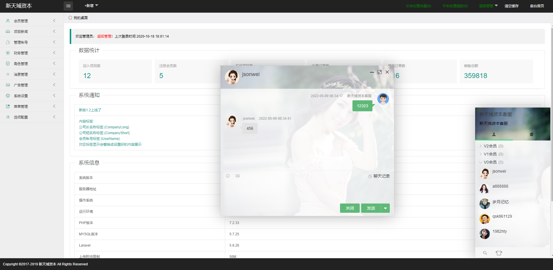 系统自带客服系统,后台可查看在线回复等