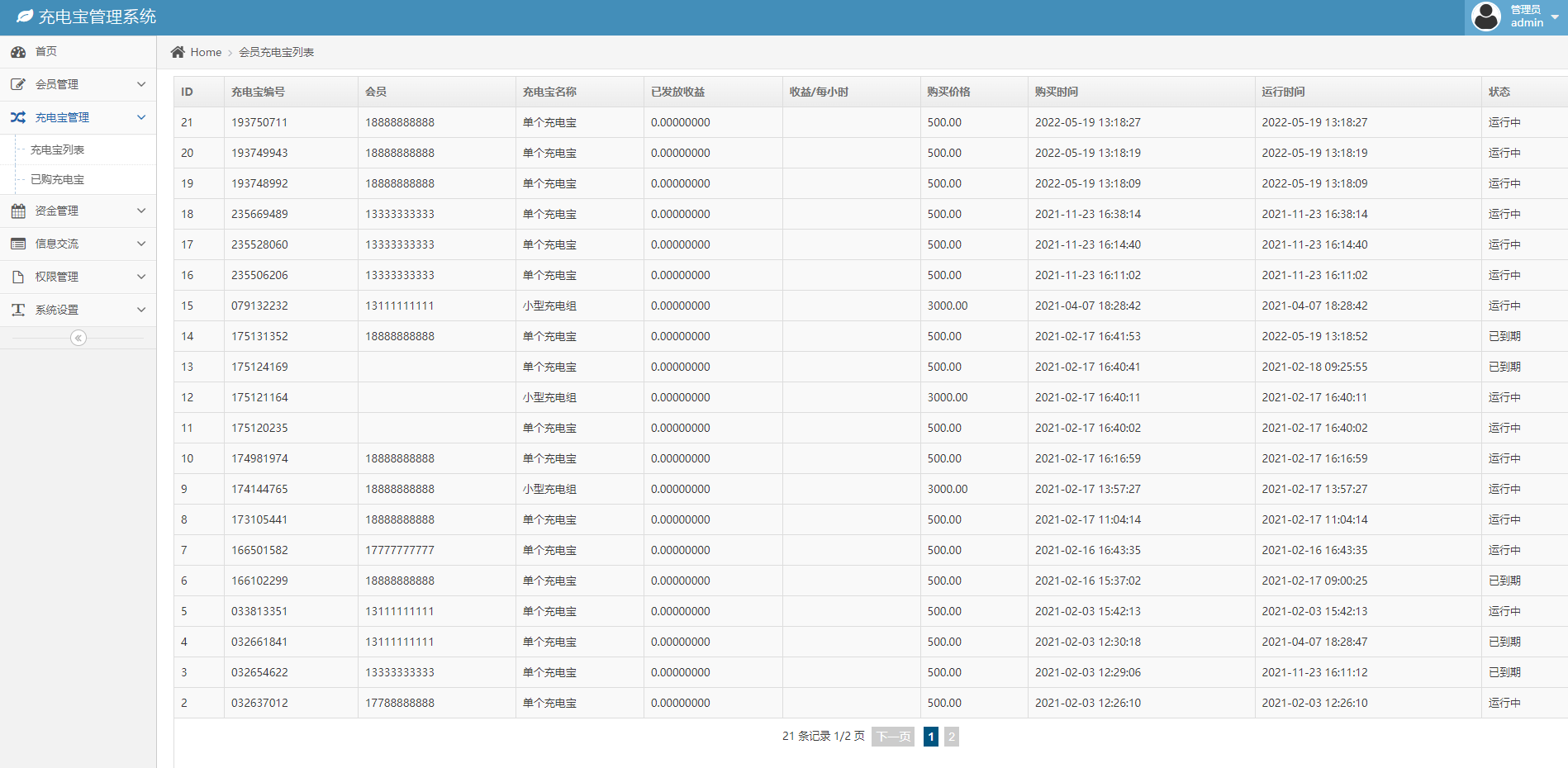 支持后台自定义添加充电宝,支持给指定人赠送充电宝,支持后台余额充值。