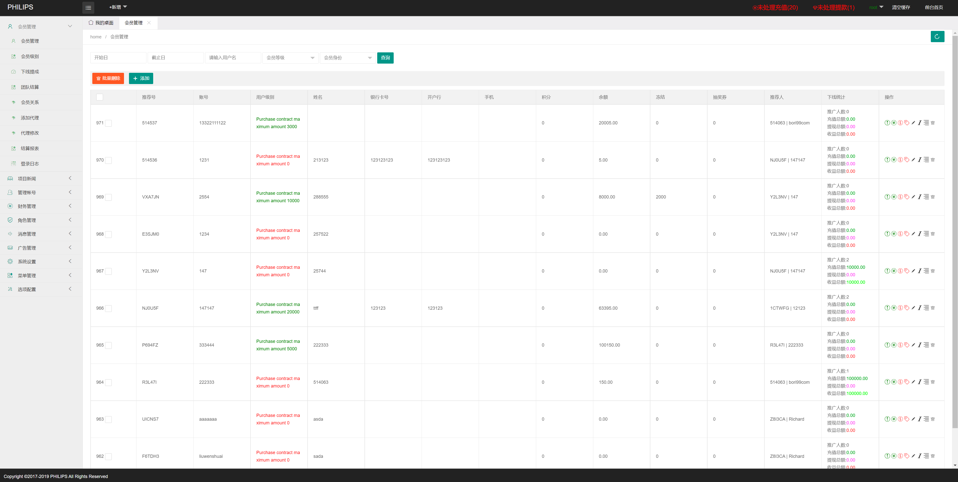 新增代理后台,数据详细,可查看下线和下线统计