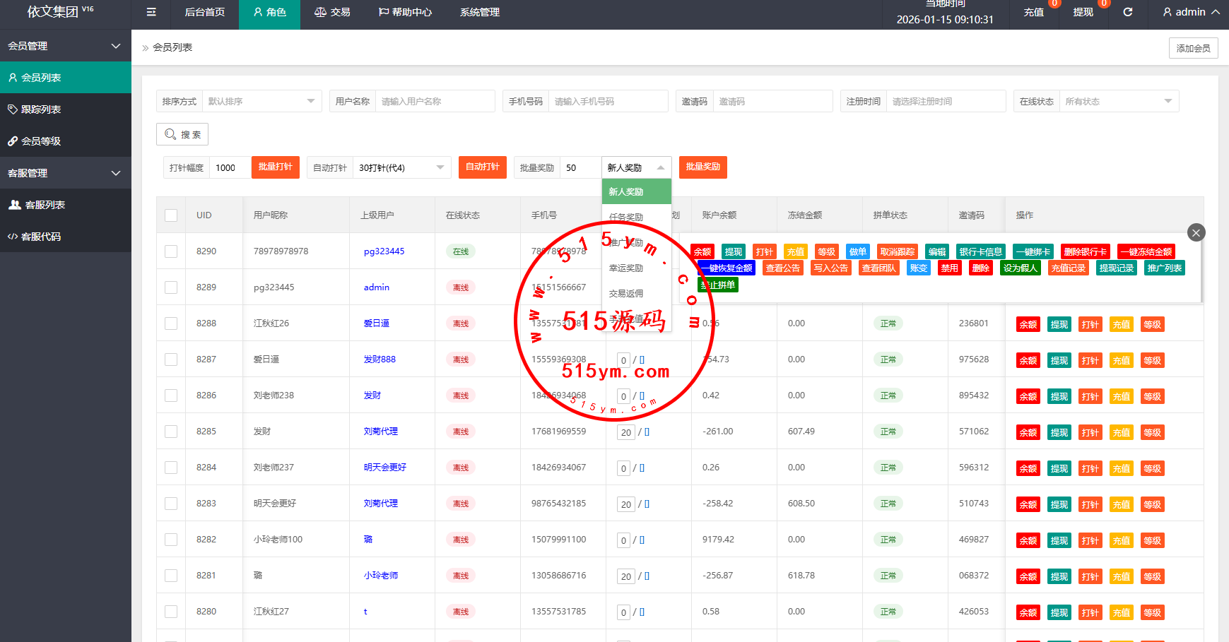 批量打针,批量奖励,信誉分,会员跟踪,一键冻结,一键绑卡等功能