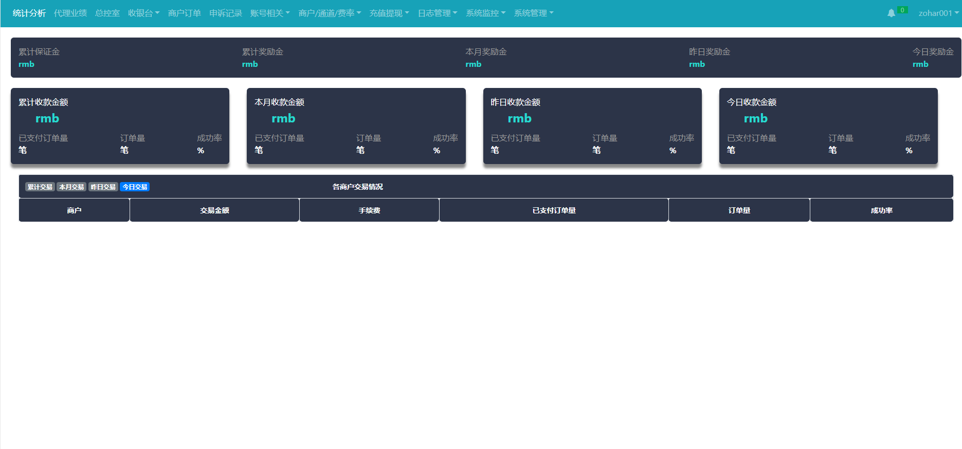 系统功能:统计分析、会员管理、日志管理、订单管理、收银台、代理业绩,