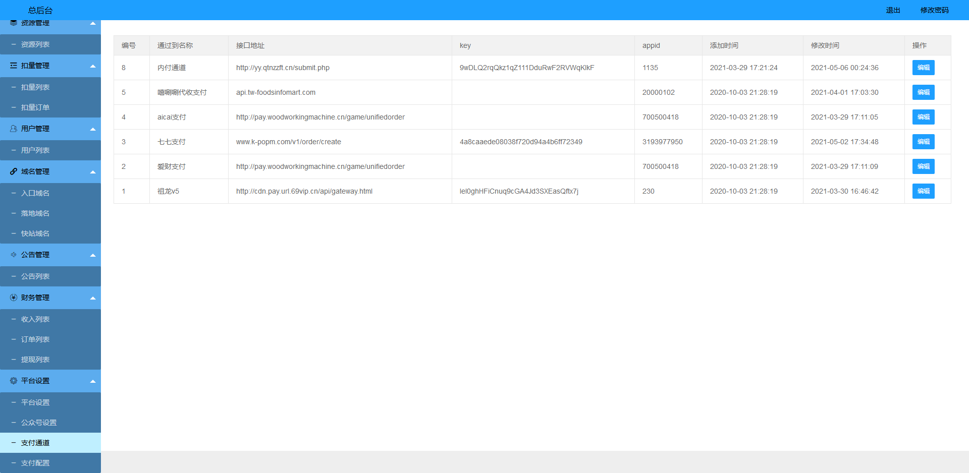 4、系统自带市面上常用的支付接口,一键配置,也可以增加新接口;
