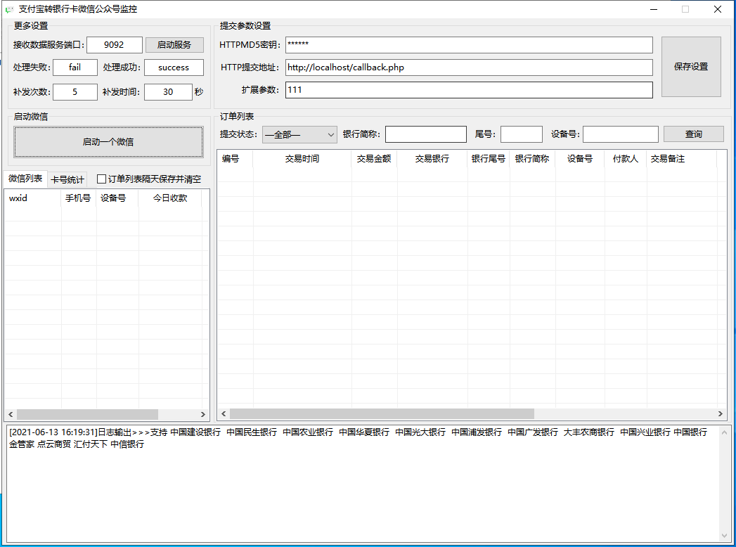 功能说明:实现对pc版微信监控公众号银行卡到账通知达到收款回调通知的作用。